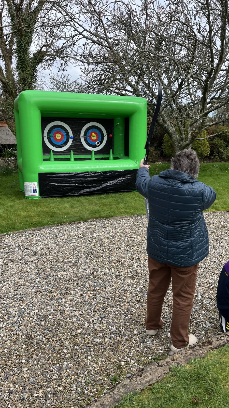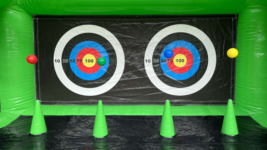 The shooting wall now comes with Archery & NERF shooting gear. But don't worry, the arrows are safe and have a foam head to prevent injury or puncture of the inflatable target!