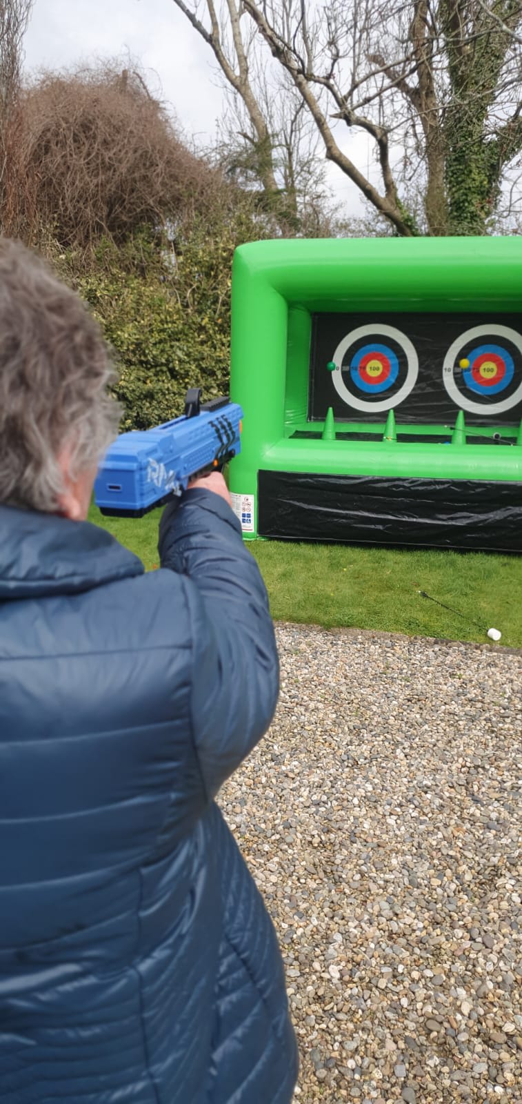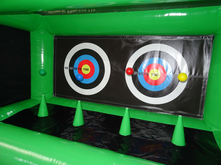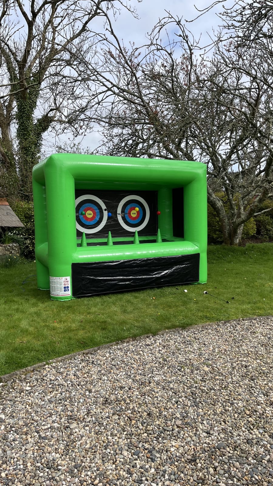The shooting wall now comes with Archery & NERF shooting gear. But don't worry, the arrows are safe and have a foam head to prevent injury or puncture of the inflatable target!